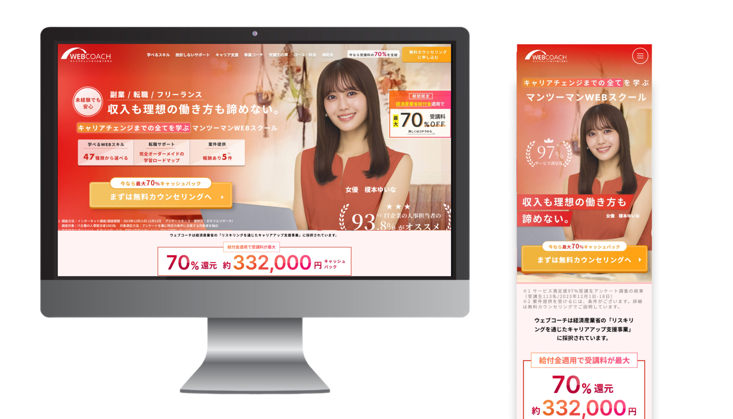 WEBCOACHは、キャリアチェンジまでの全てを学び理想の〝収入と働き方″、どちらも叶えるためのマンツーマンWEBスクールです。